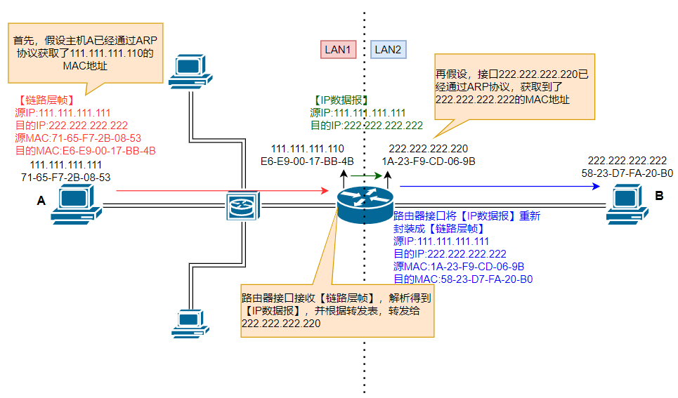 主机 A 获取到目标接口的 MAC 地址,先构造 IP 数据报,其中源 IP 是 A 的 IP 地址,目的 IP 地址是 B 的 IP 地址,再构造链路层帧,其中源 MAC 地址是 A 的 MAC 地址,目的 MAC 地址是本子网内与路由器连接的接口的 MAC 地址。主机 A 将把这个链路层帧,以单播的方式,发送给目标接口。
