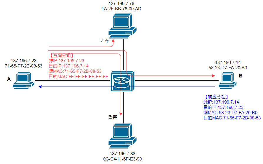 FF-FF-FF-FF-FF-FF,之前说过,该 MAC 地址是广播地址,也就是说,查询分组将广播给该局域网内的所有设备。主机 A 构造的查询分组将在该局域网内广播,理论上,每一个设备都会收到该分组,并检查查询分组的接收 IP 地址是否为自己的 IP 地址,如果是,说明查询分组已经到达了主机 B,否则,该查询分组对当前设备无效,丢弃之。