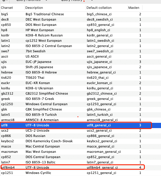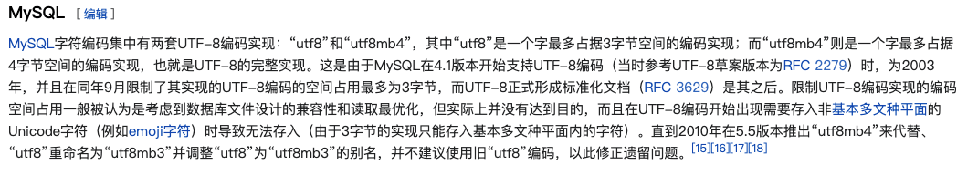 MySQL 字符编码集中有两套 UTF-8 编码实现:utf8 和 utf8mb4。