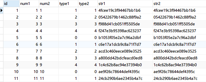 测试表一共建立了 7 个字段(包括主键),num1和num2保存的是和ID一样的顺序数字,其中num2是字符串类型。type1和type2保存的都是主键对 5 的取模,目的是模拟实际应用中常用类似 type 类型的数据,但是type2是没有建立索引的。str1和str2都是保存了一个 20 位长度的随机字符串,str1不能为NULL,str2允许为NULL,相应的生成测试数据的时候我也会在str2字段生产少量NULL值(每 100 条数据产生一个NULL值)。