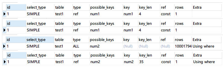 先看第 2 条 SQL:SELECT * FROM `test1` WHERE num1 = '10000'; 左边为 int 类型10000,转换为浮点数还是10000,右边字符串类型'10000',转换为浮点数也是10000。两边的转换结果都是唯一确定的,所以不影响使用索引。