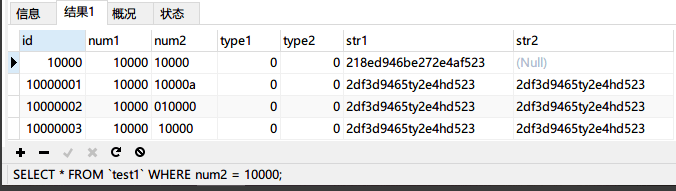 然后使用第三条 SQL 语句SELECT * FROM `test1` WHERE num2 = 10000;进行查询: