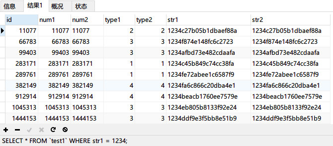 再次写一条 SQL 查询 str1 字段:SELECT * FROM `test1` WHERE str1 = 1234;