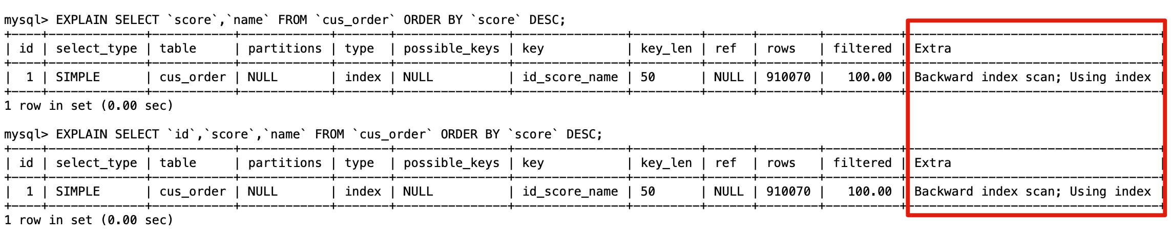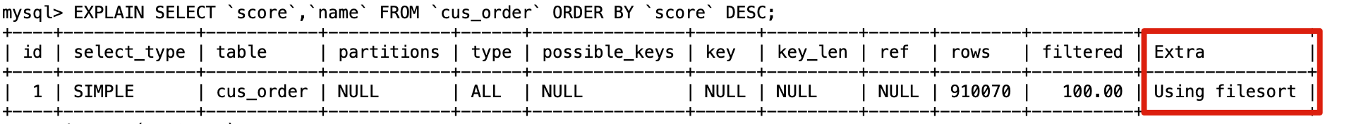 mysql> EXPLAIN SELECT `score`,`name` FROM `cus_order` ORDER BY `score` DESC;