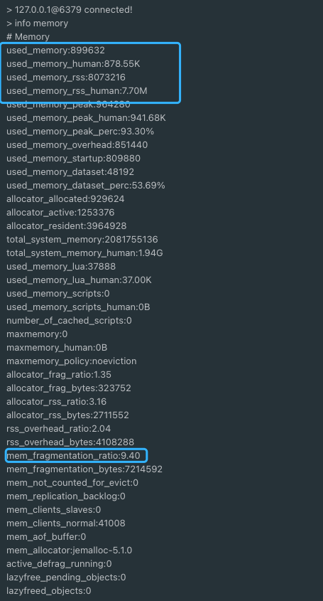 如果想要快速查看内存碎片率的话,你还可以通过下面这个命令: