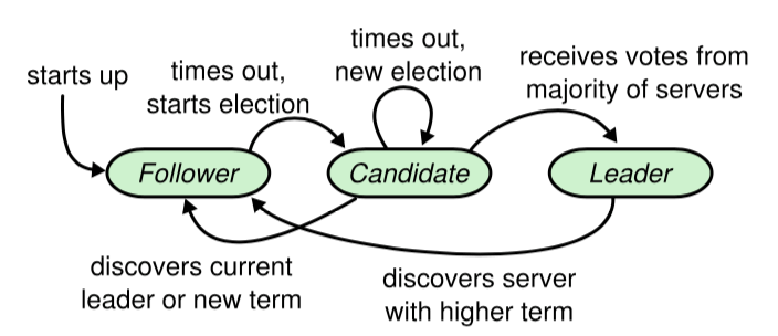 一个 Raft 集群包括若干服务器,以典型的 5 服务器集群举例。在任意的时间,每个服务器一定会处于以下三个状态中的一个: