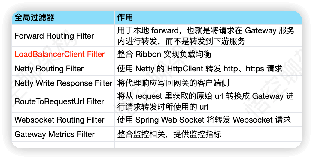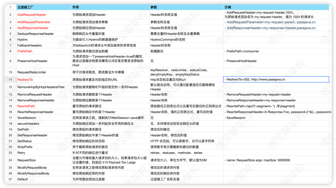 - GatewayFilter:局部过滤器,应用在单个路由或一组路由上的过滤器。标红色表示比较常用的过滤器。