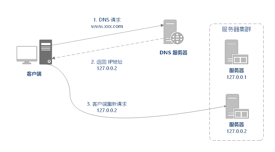 DNS 解析实现负载均衡的原理是这样的:在 DNS 服务器中为同一个主机记录配置多个 IP 地址,这些 IP 地址对应不同的服务器。当用户请求域名的时候,DNS 服务器采用轮询算法返回 IP 地址,这样就实现了轮询版负载均衡。