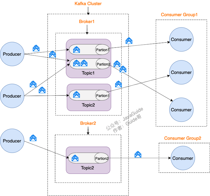 - Partition(分区) : Partition 属于 Topic 的一部分。一个 Topic 可以有多个 Partition ,并且同一 Topic 下的 Partition 可以分布在不同的 Broker 上,这也就表明一个 Topic 可以横跨多个 Broker 。这正如我上面所画的图一样。