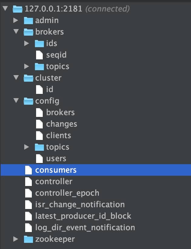 下图就是我的本地 Zookeeper ,它成功和我本地的 Kafka 关联上(以下文件夹结构借助 idea 插件 Zookeeper tool 实现)。