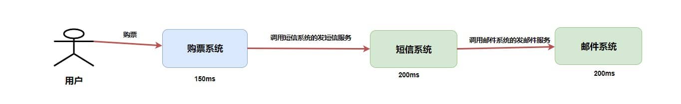 我们省略中间的网络通信时间消耗,假如购票系统处理需要 150ms ,短信系统处理需要 200ms ,那么整个处理流程的时间消耗就是 150ms + 200ms = 350ms。