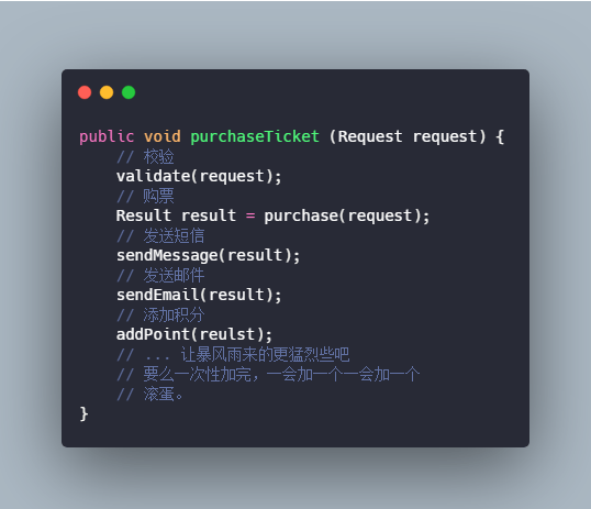 那么第二步,我们又添加了一个发送邮件,我们就得重新去修改代码,如果我们又加一个需求:用户购买完还需要给他加积分,这个时候我们是不是又得改代码?