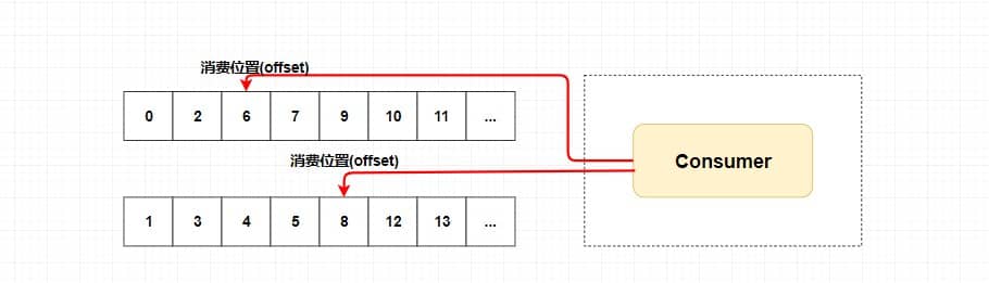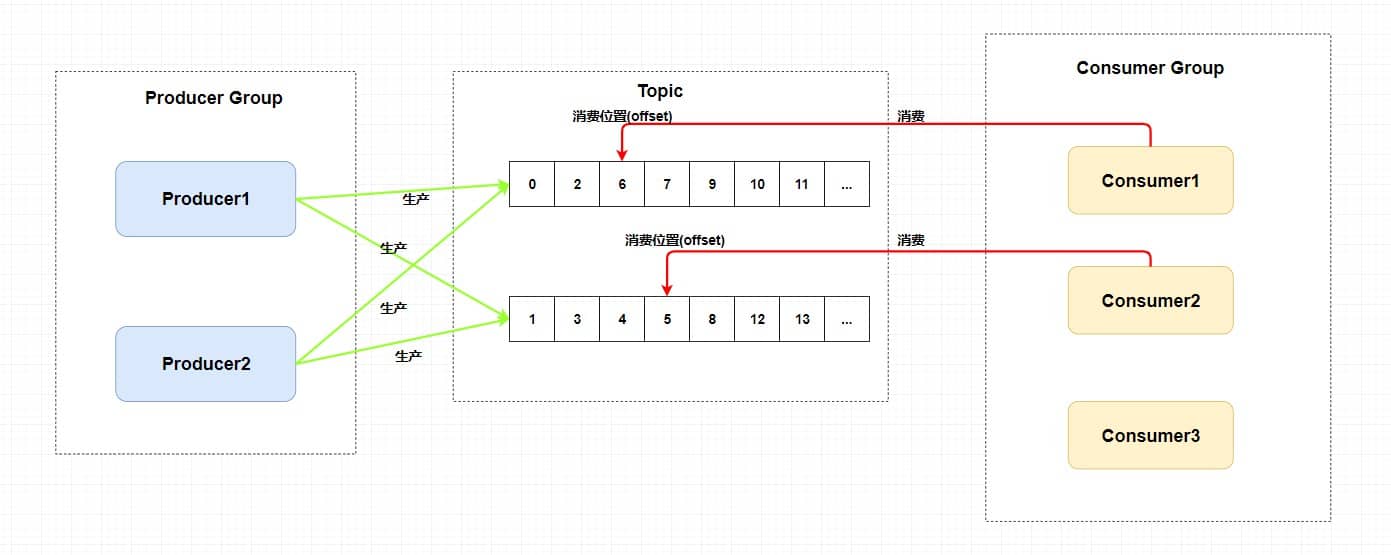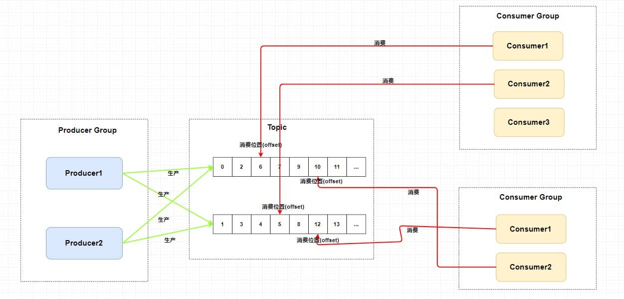 因为我们刚刚画的仅仅是一个消费者组,我们知道在发布订阅模式中一般会涉及到多个消费者组,而每个消费者组在每个队列中的消费位置都是不同的。如果此时有多个消费者组,那么消息被一个消费者组消费完之后是不会删除的(因为其它消费者组也需要呀),它仅仅是为每个消费者组维护一个 消费位移(offset) ,每次消费者组消费完会返回一个成功的响应,然后队列再把维护的消费位移加一,这样就不会出现刚刚消费过的消息再一次被消费了。