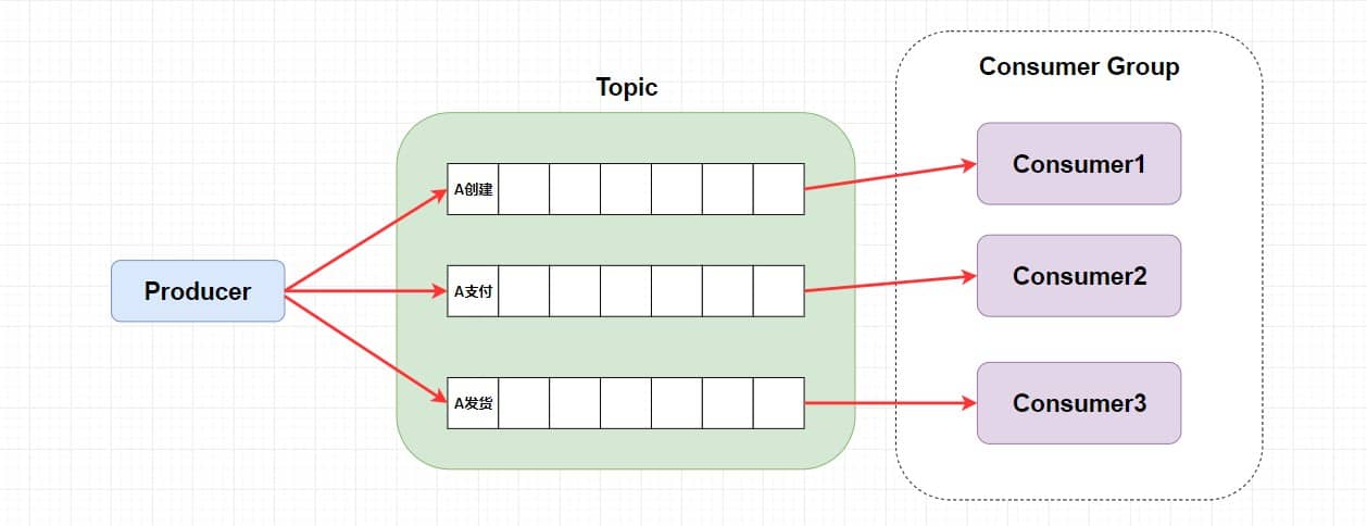 我们可以看到在整个图中有 Producer Group、Topic、Consumer Group 三个角色,我来分别介绍一下他们。