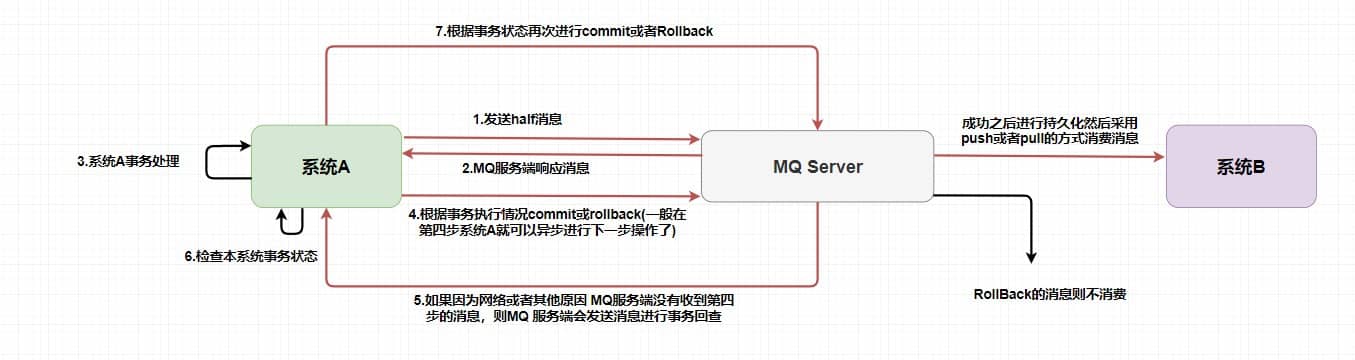 你可以试想一下,如果没有从第 5 步开始的 事务反查机制 ,如果出现网路波动第 4 步没有发送成功,这样就会产生 MQ 不知道是不是需要给消费者消费的问题,他就像一个无头苍蝇一样。在 RocketMQ 中就是使用的上述的事务反查来解决的,而在 Kafka 中通常是直接抛出一个异常让用户来自行解决。
