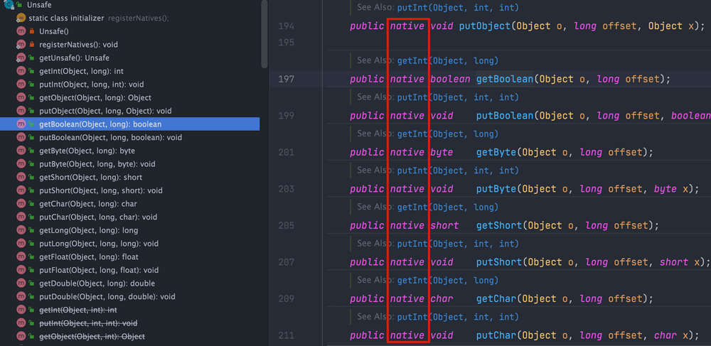 另外,Unsafe 提供的这些功能的实现需要依赖本地方法(Native Method)。你可以将本地方法看作是 Java 中使用其他编程语言编写的方法。本地方法使用 native 关键字修饰,Java 代码中只是声明方法头,具体的实现则交给 本地代码。