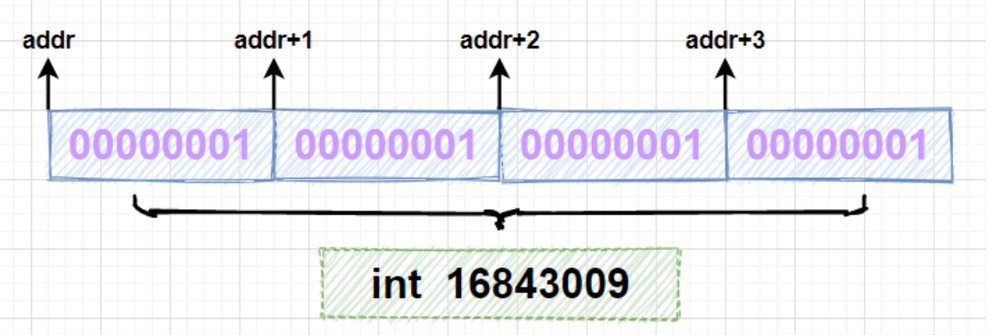 分析一下运行结果,首先使用allocateMemory方法申请 4 字节长度的内存空间,调用setMemory方法向每个字节写入内容为byte类型的 1,当使用 Unsafe 调用getInt方法时,因为一个int型变量占 4 个字节,会一次性读取 4 个字节,组成一个int的值,对应的十进制结果为 16843009。