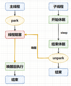 程序运行的流程也比较容易看懂,子线程开始运行后先进行睡眠,确保主线程能够调用park方法阻塞自己,子线程在睡眠 5 秒后,调用unpark方法唤醒主线程,使主线程能继续向下执行。整个流程如下图所示: