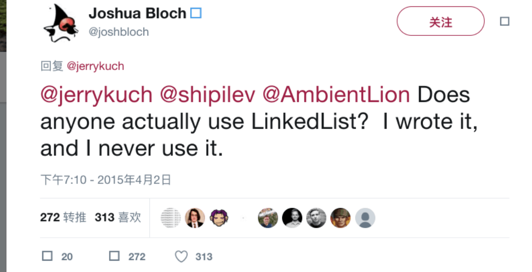不过,我们在项目中一般是不会使用到 LinkedList 的,需要用到 LinkedList 的场景几乎都可以使用 ArrayList 来代替,并且,性能通常会更好!就连 LinkedList 的作者约书亚 · 布洛克(Josh Bloch)自己都说从来不会使用 LinkedList 。