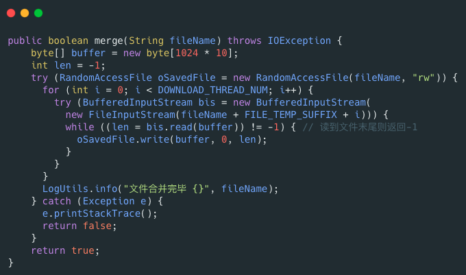 RandomAccessFile 可以帮助我们合并文件分片,示例代码如下: