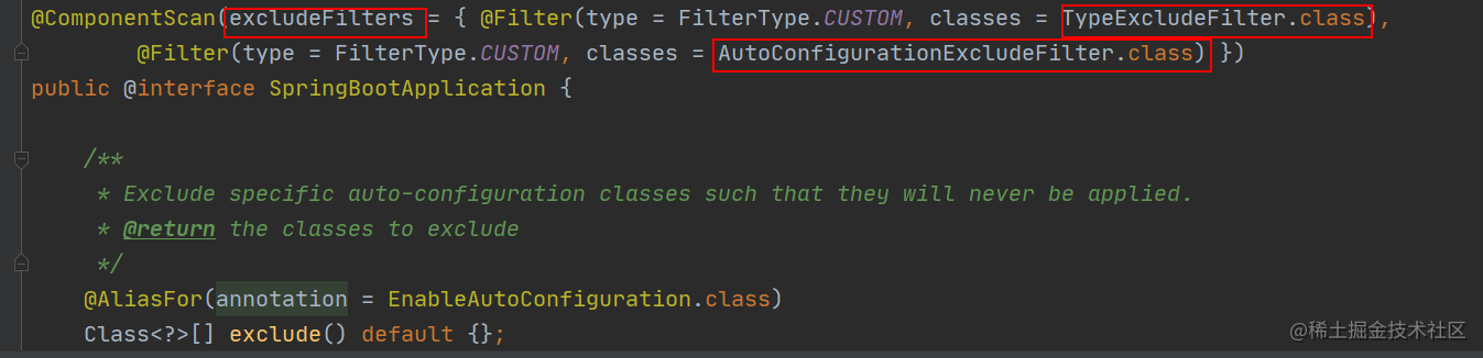 @EnableAutoConfiguration:启用 SpringBoot 的自动配置机制@Configuration:允许在上下文中注册额外的 bean 或导入其他配置类@ComponentScan:扫描被@Component(@Service,@Controller)注解的 bean,注解默认会扫描启动类所在的包下所有的类 ,可以自定义不扫描某些 bean。如下图所示,容器中将排除TypeExcludeFilter和AutoConfigurationExcludeFilter。