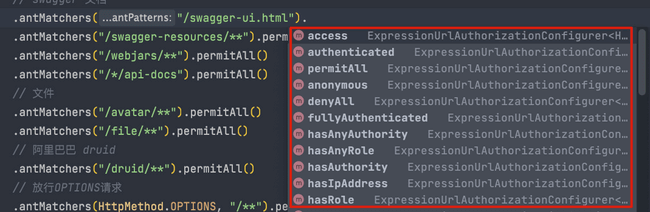 permitAll():无条件允许任何形式访问,不管你登录还是没有登录。anonymous():允许匿名访问,也就是没有登录才可以访问。denyAll():无条件决绝任何形式的访问。authenticated():只允许已认证的用户访问。fullyAuthenticated():只允许已经登录或者通过 remember-me 登录的用户访问。hasRole(String): 只允许指定的角色访问。hasAnyRole(String): 指定一个或者多个角色,满足其一的用户即可访问。hasAuthority(String):只允许具有指定权限的用户访问hasAnyAuthority(String):指定一个或者多个权限,满足其一的用户即可访问。hasIpAddress(String): 只允许指定 ip 的用户访问。