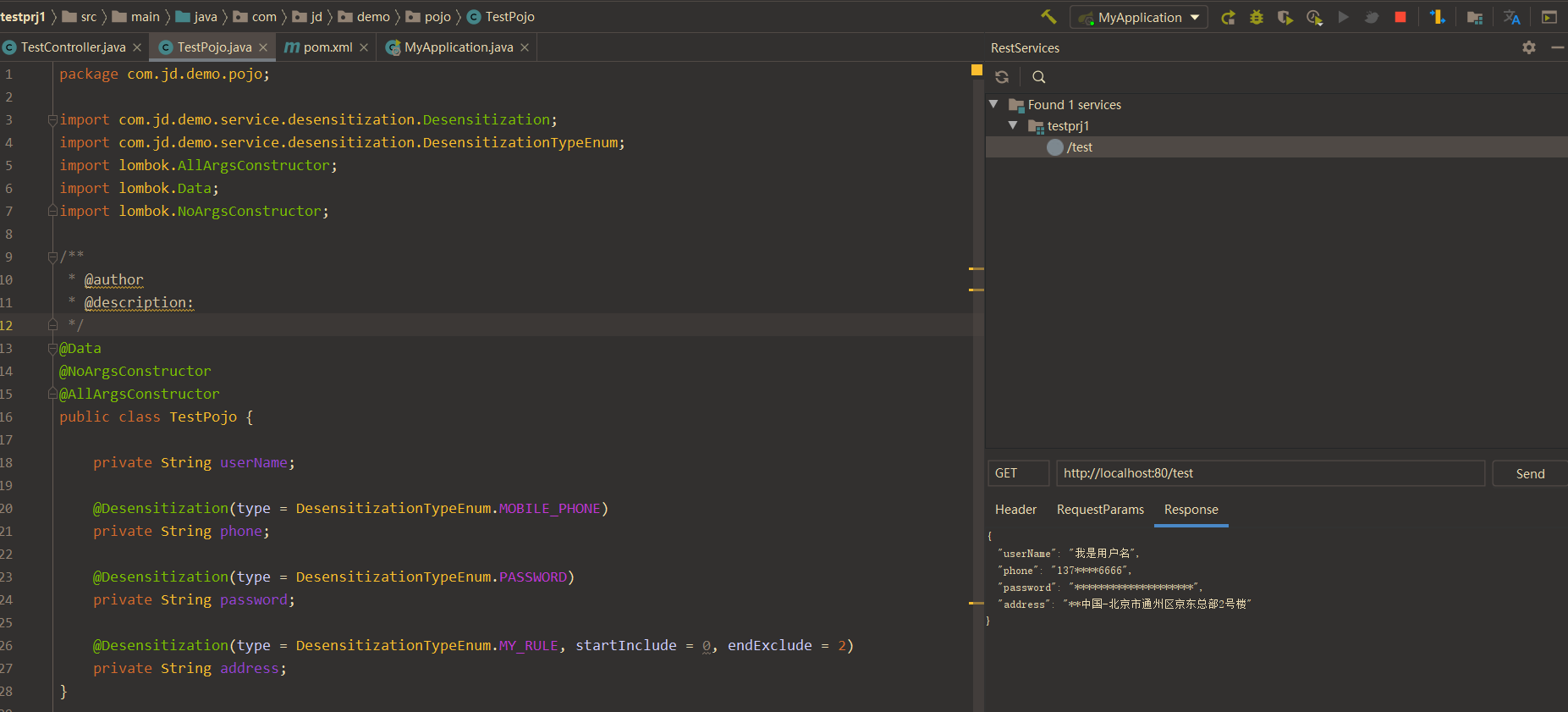 public TestPojo testDesensitization(){
