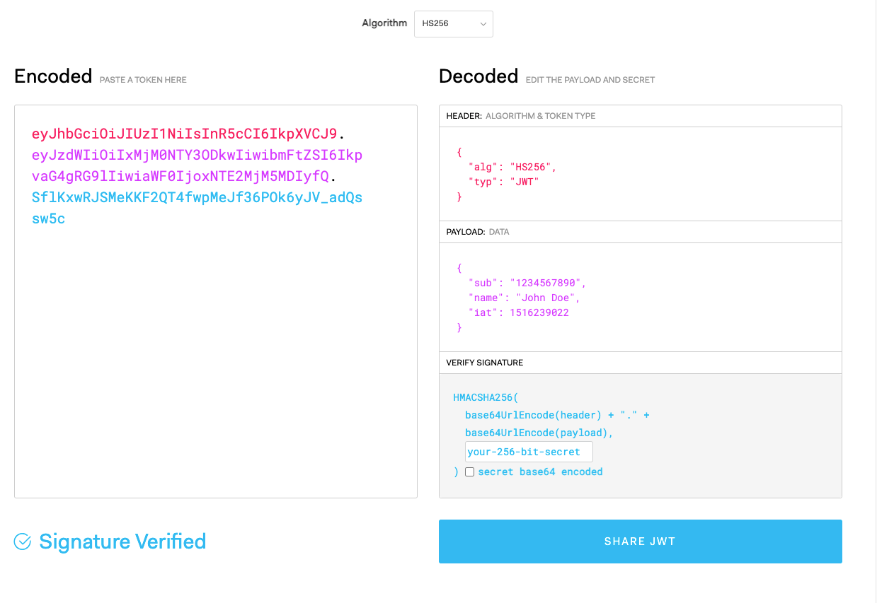 你可以在 jwt.io 这个网站上对其 JWT 进行解码,解码之后得到的就是 Header、Payload、Signature 这三部分。