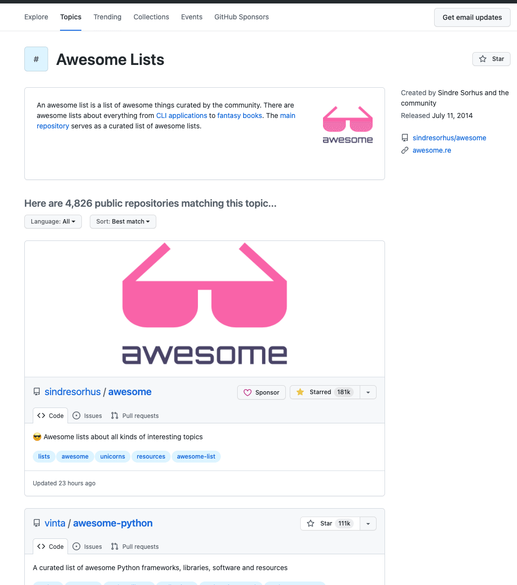 - Githunb Topics 按照类别/话题将一些项目进行了分类汇总。比如 Data visualization 汇总了数据可视化相关的一些开源项目,Awesome Lists 汇总了 Awesome 系列的仓库;
