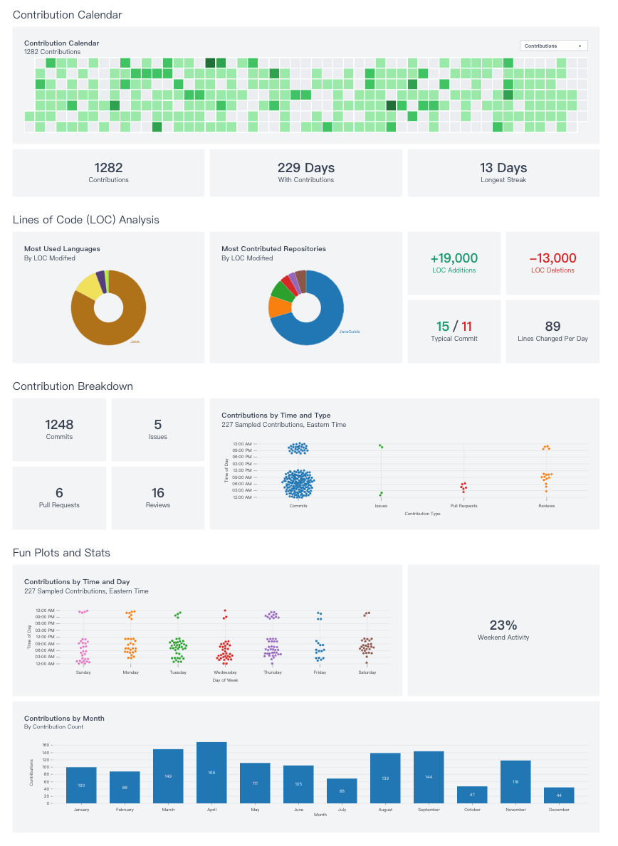 通过 https://www.githubtrends.io/wrapped 这个网站,你可以生成一份 Github 个人年报,这个年报会列举出你在这一年的项目贡献情况、最常使用的编程语言、详细的贡献信息。