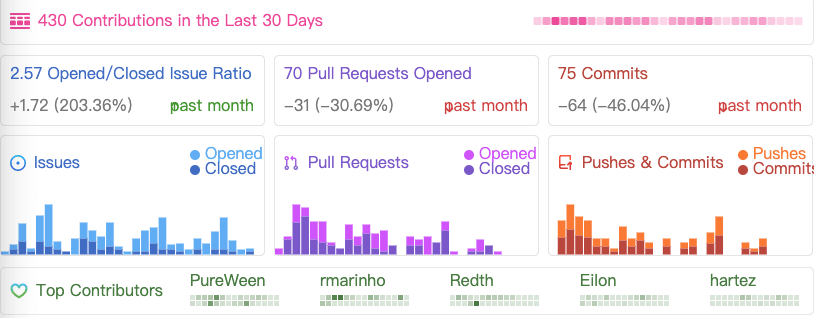 通过 repobeats 这个工具可以为 Github 项目添加如下图所示的项目贡献基本情况图表,挺不错的 👍