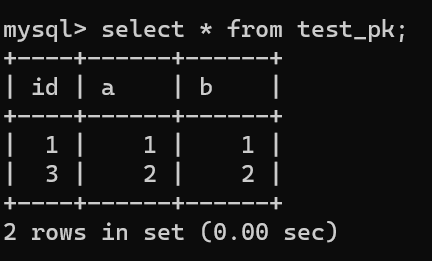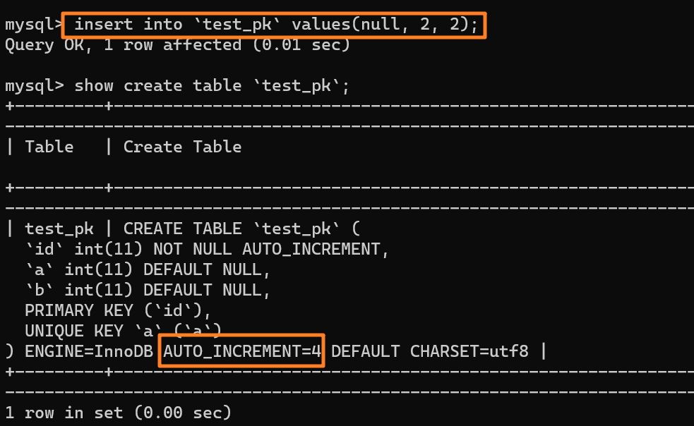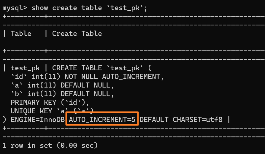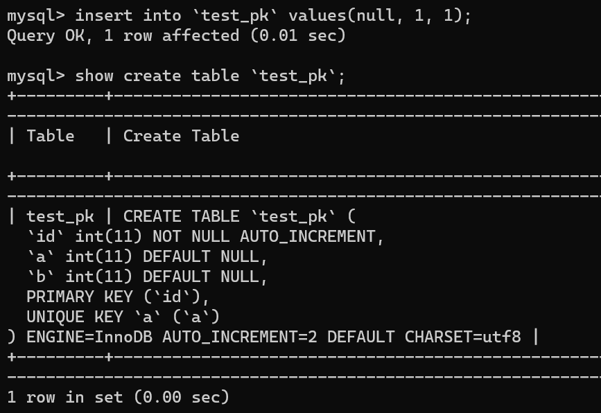 使用 insert into test_pk values(null, 1, 1) 插入一行数据,再执行 show create table 命令来看一下表的结构定义: