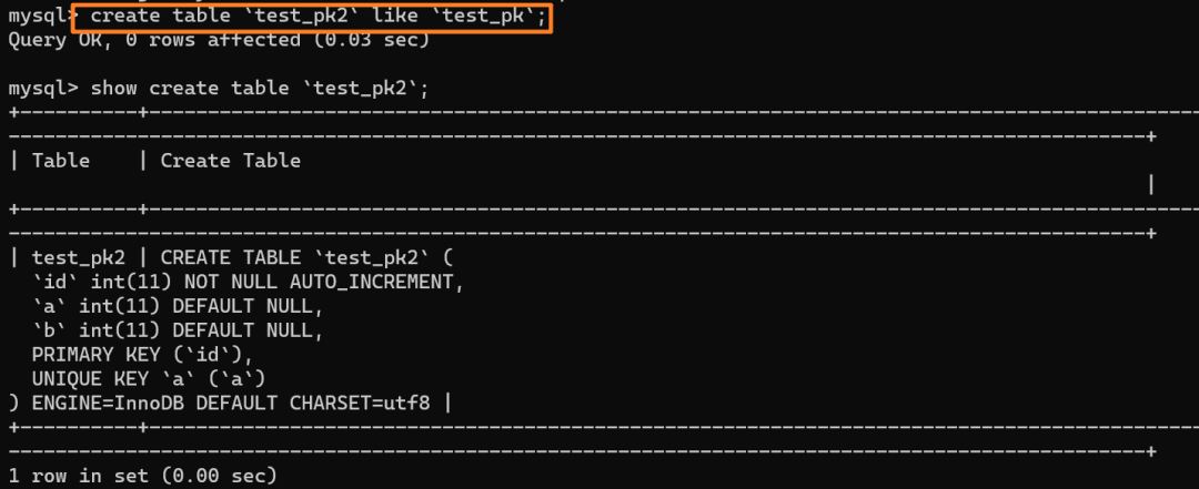 我们创建一个和当前表 test_pk 有相同结构定义的表 test_pk2: