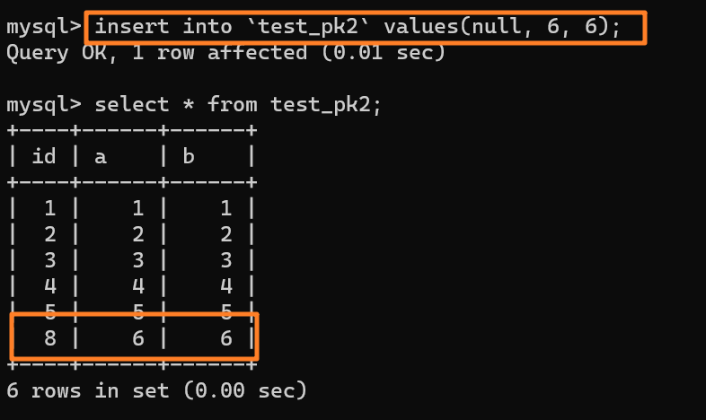 由于这条语句实际只用上了 5 个 id,所以 id=6 和 id=7 就被浪费掉了。之后,再执行 insert into test_pk2 values(null,6,6),实际上插入的数据就是(8,6,6):