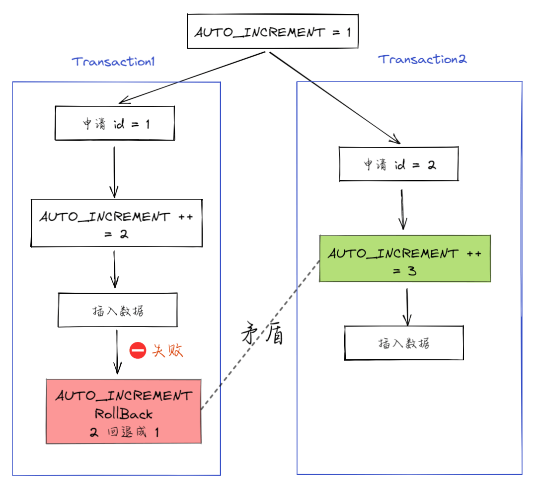- 事务 B 正确提交了,但事务 A 出现了唯一键冲突,也就是 id = 1 的那行记录插入失败了,那如果允许事务 A 把自增 id 回退,也就是把表的当前自增值改回 1,那么就会出现这样的情况:表里面已经有 id = 2 的行,而当前的自增 id 值是 1。