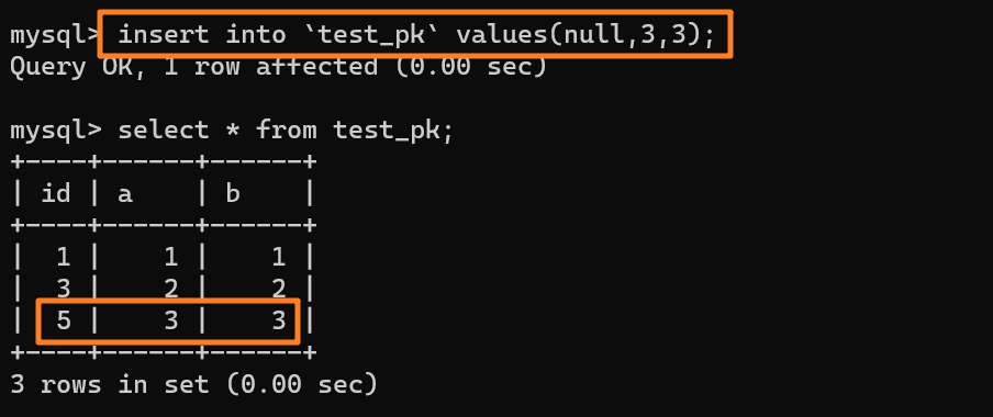 所以这时候我们再去插入一条数据(null, 3, 3)的时候,主键 id 就会被自动赋为 5 了: