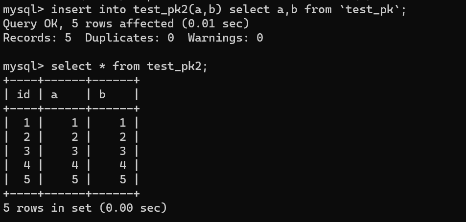 然后使用 insert...select 往 teset_pk2 表中批量插入数据:
